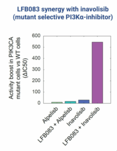 Our second program, LFB083, targets a synthetic lethality relationship with PIK3CA gain of function mutations. These cause more than 100,000 cases of cancer per year in the US alone, including a third of all breast cancer. LFB083 increases activity of mutant selective PI3K alpha inhibitors more than ten-fold with minimal impact on healthy cells.