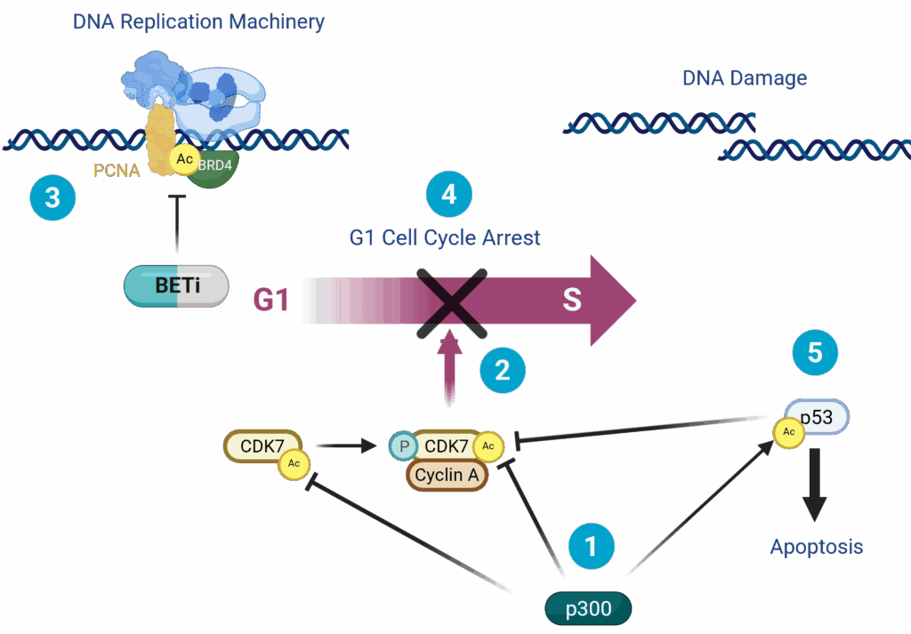 We and others have discovered that BETi disrupts BRD4-dependent recruitment of PCNA and DNA replication machinery, which typically leads to G1 cell cycle arrest. However, in the context of EP300 LOF, cell cycle checkpoint regulation of G1 to S transition is lost and the cells progress anyway, leading to mitotic catastrophe and apoptosis.