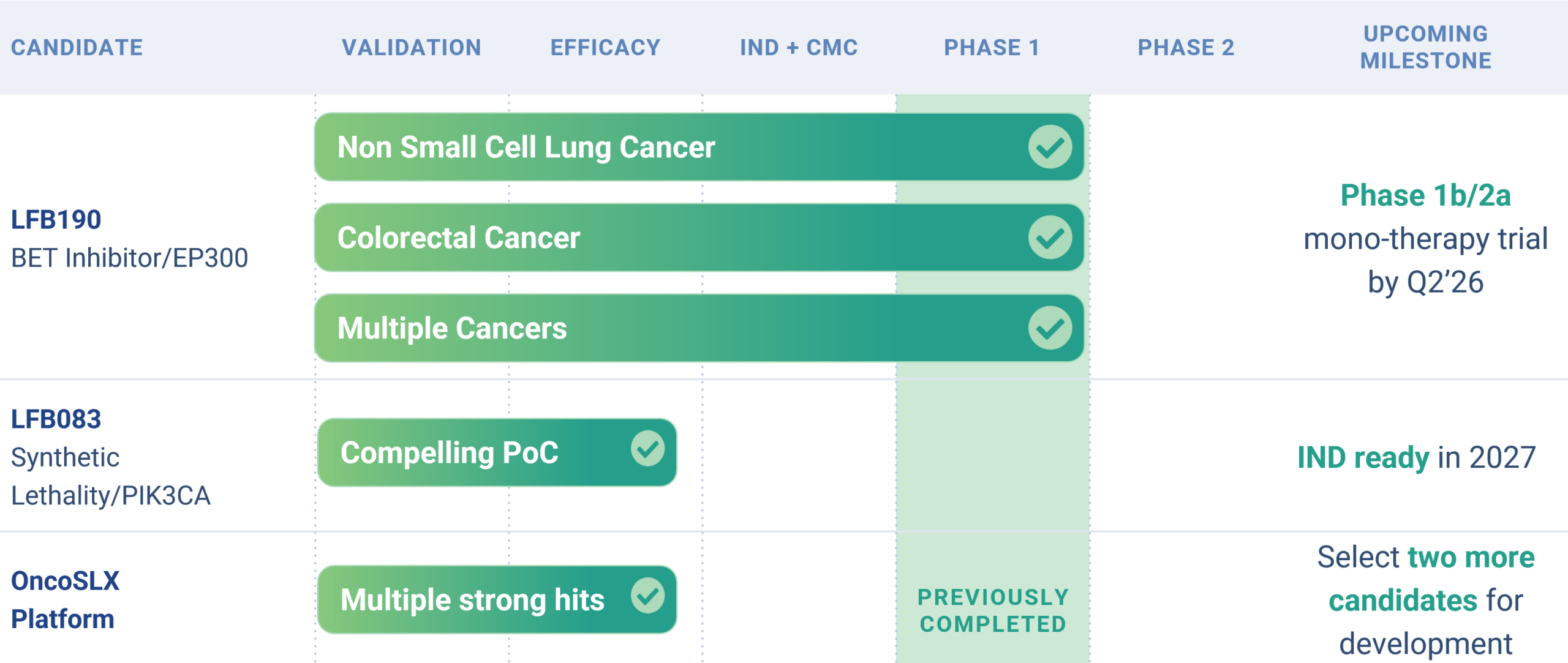 Leapfrog Bio is initiating a Phase 1b/2a clinical trial of our lead program, LFB190, in 2026. LFB190 is a best-in-class BET inhibitor being developed for the treatment of EP300 loss-of-function (LOF) mutant cancers, a patient population with significant unmet medical need.